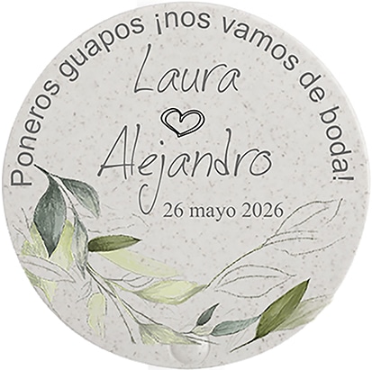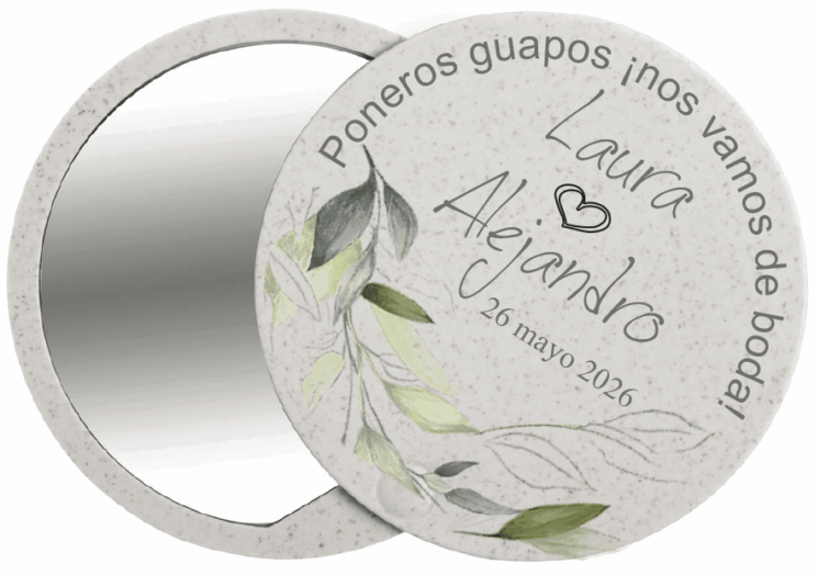 Para completar esta experiencia digital, os ofrecemos un precioso espejo de bolso personalizado con un diseƱo floral romƔntico. En la parte delantera, incluye vuestros nombres, la fecha de la boda y la frase: