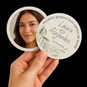 Este original espejo puede entregarse en mano, incluirse en las cajas de detalles o acompaƱar a las invitaciones fĆsicas. De esta manera, cada invitado tendrĆ” a su alcance toda la información necesaria de forma rĆ”pida, mientras conserva un bonito recuerdo de vuestra boda.