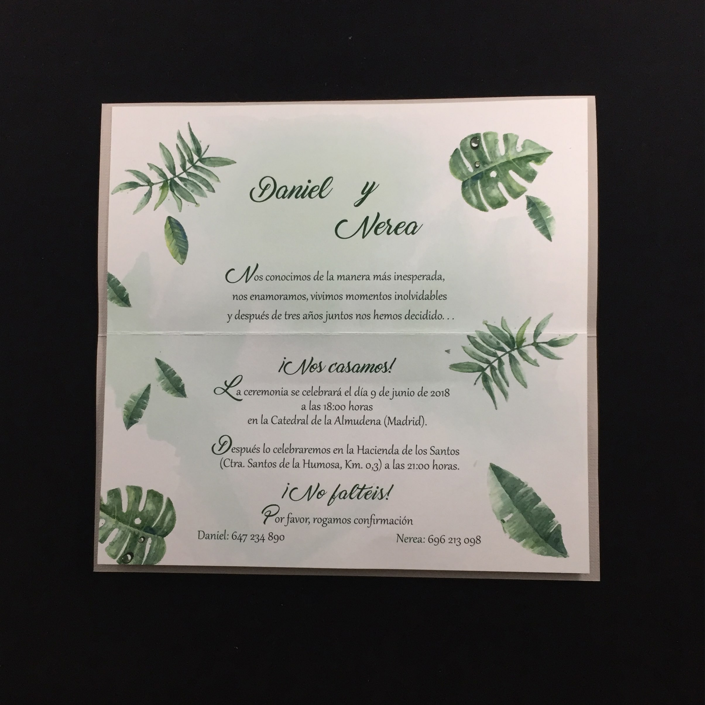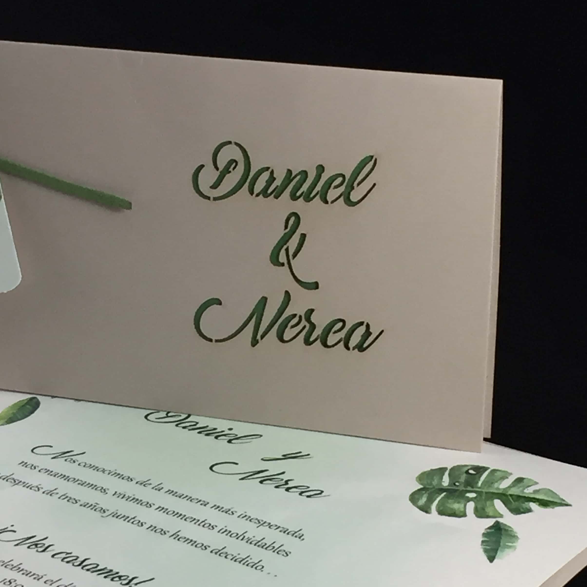 Cartulina gofrada gris de 250 gr. troquelado de los nombres en la portada con técnica láser.