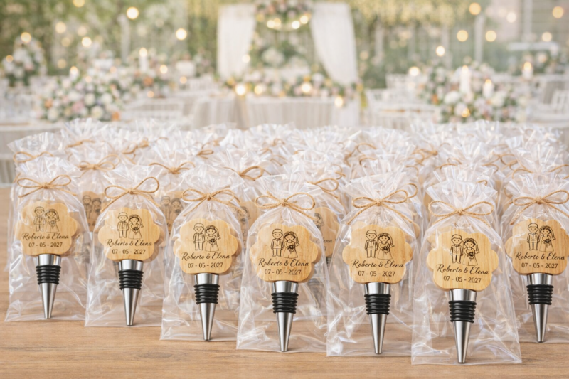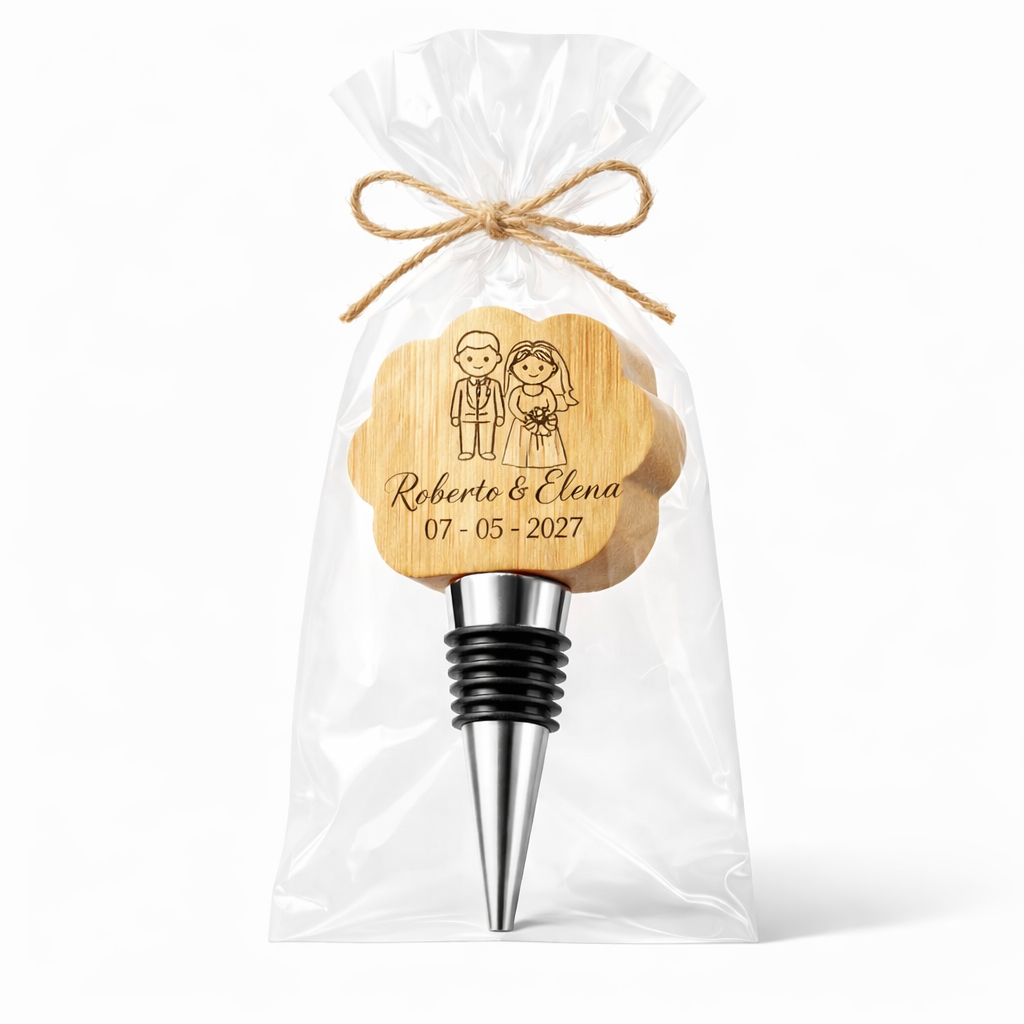 Cada tapón se entrega en bolsa de presentación individual, listo para regalar. Este detalle facilita la organización del evento y aporta un toque cuidado y profesional a la entrega de los recuerdos. Es una opción ideal tanto para bodas íntimas como para celebraciones con un gran número de invitados.